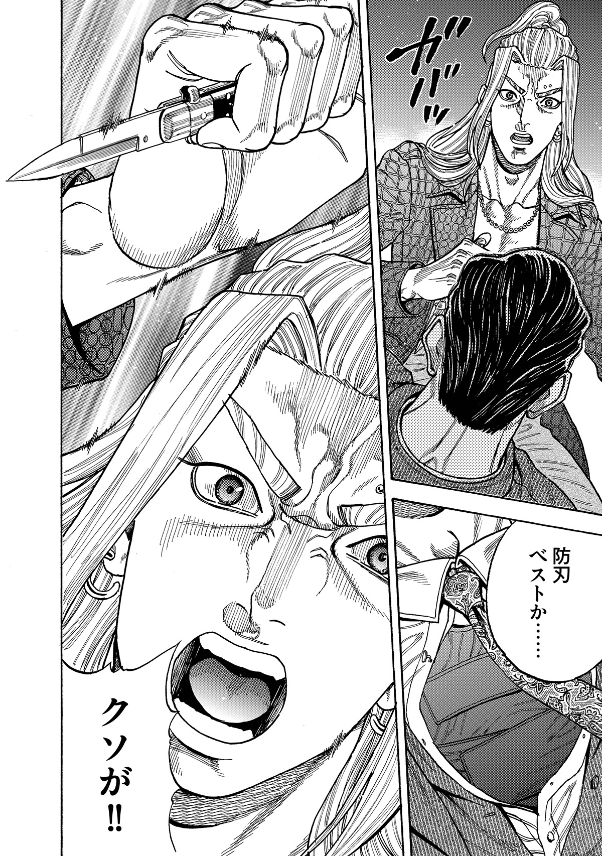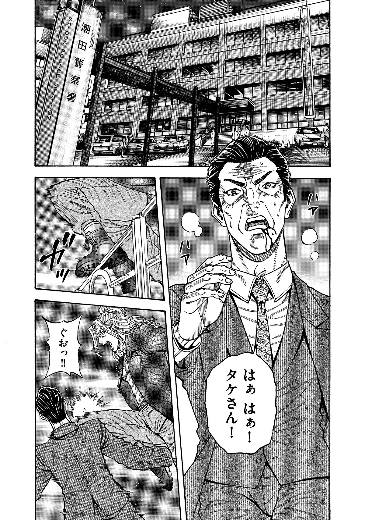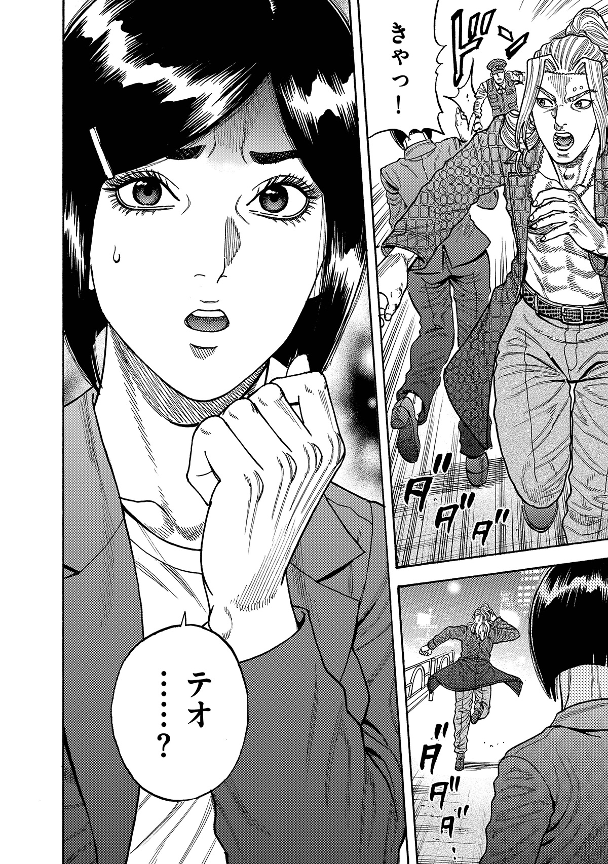 テオに追われるクラブ経営者・古田は車行き交う道路に飛び出し、命がけの街頭チェイスを繰り広げる。車にはねられ手負いの古田に、眞島たちの“根城”潮田署の目前で追いつき、繰り返し凶刃を突き立てるテオ。そこへやって来たのは……。