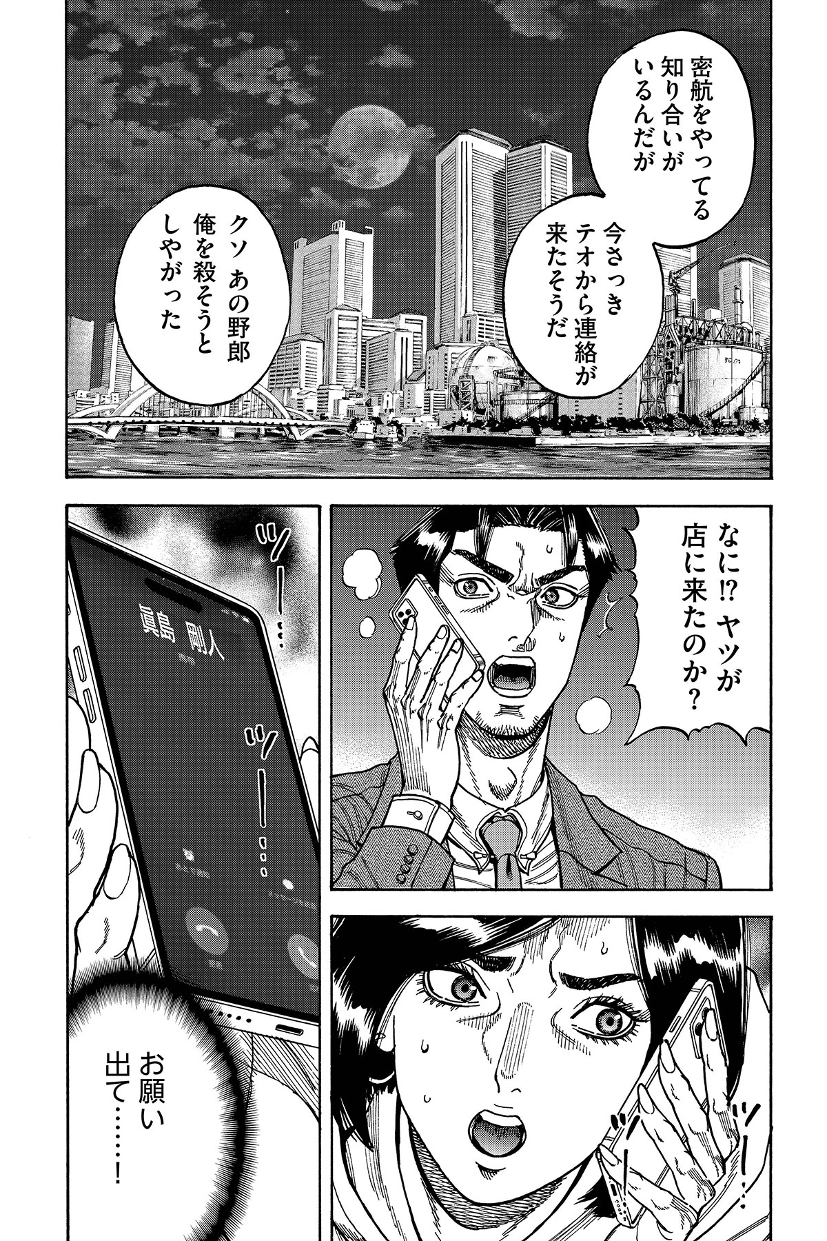 アジトを捨て逃亡を図るテオを、追う眞島。その頃、かの凶人の姿は、あろうことか眞島の想い人・明美のブラジル料理店に。テオから身を隠し、こっそり眞島に電話をかける明美。異変に気づき、にじり寄るテオ。息を切らした眞島が店のドアを開けたとき、目にした光景はーー。
