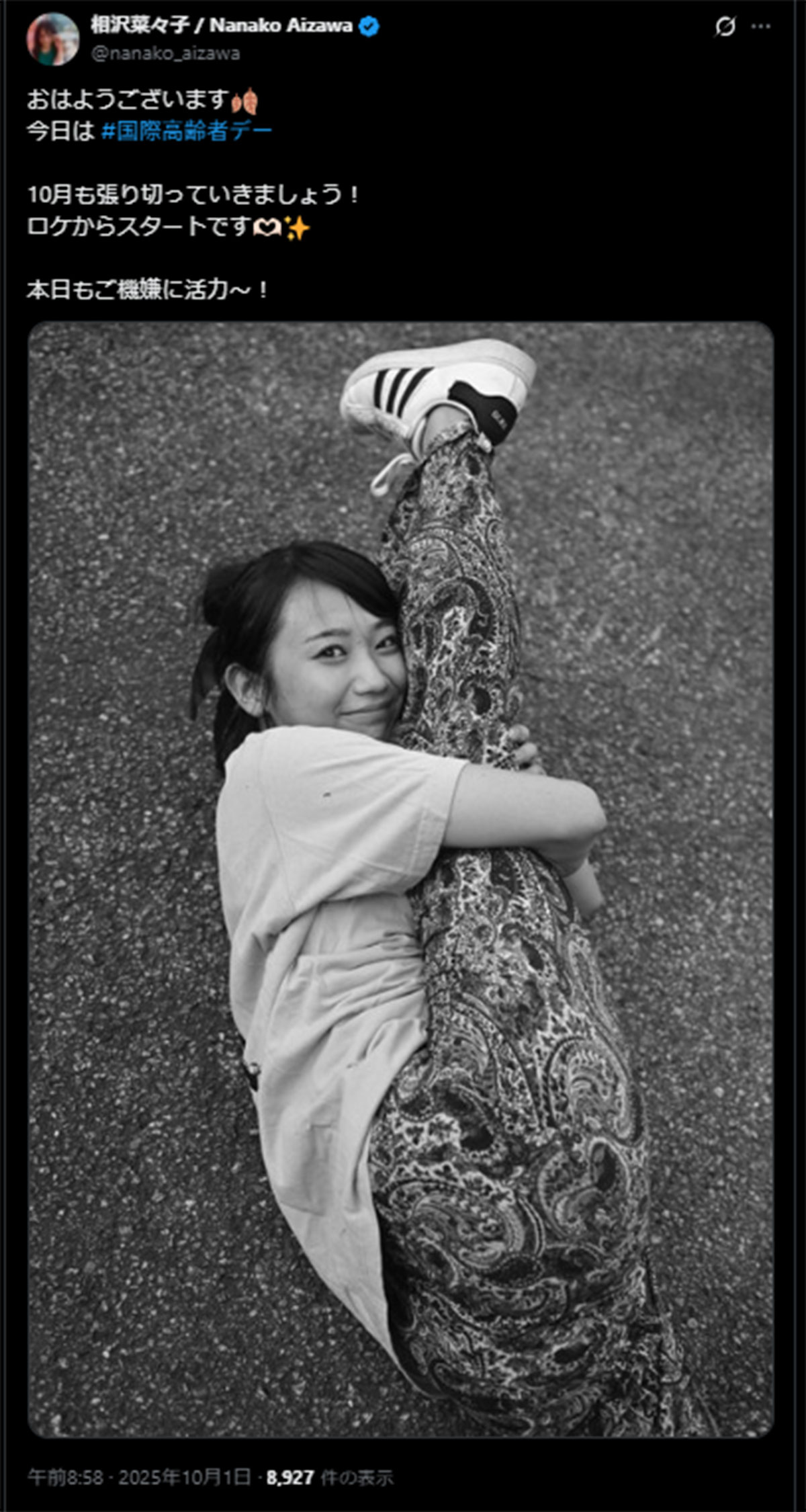 「股下110cmにしか見えない」ファンも驚愕 9頭身スタイル誇る相沢菜々子が“脚長ショット”を披露(画像1/2)公開日:2025.10.01 更新日:2025.10.01