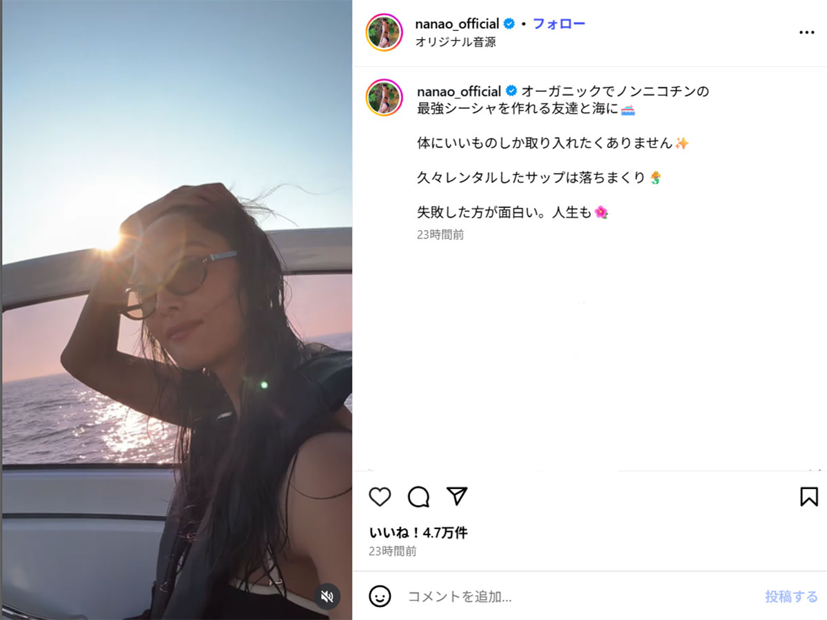 「ひも」ビキニを着用しバリの海でマンタに遭遇した、菜々緒(6月17日投稿の本人のInstagramより)