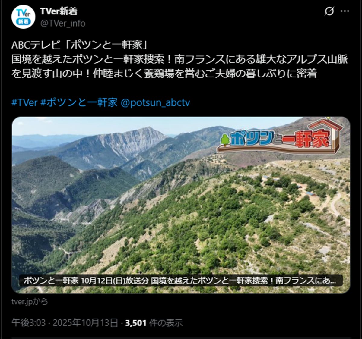 バラエティ番組『ポツンと一軒家』(TVer新着のXより)