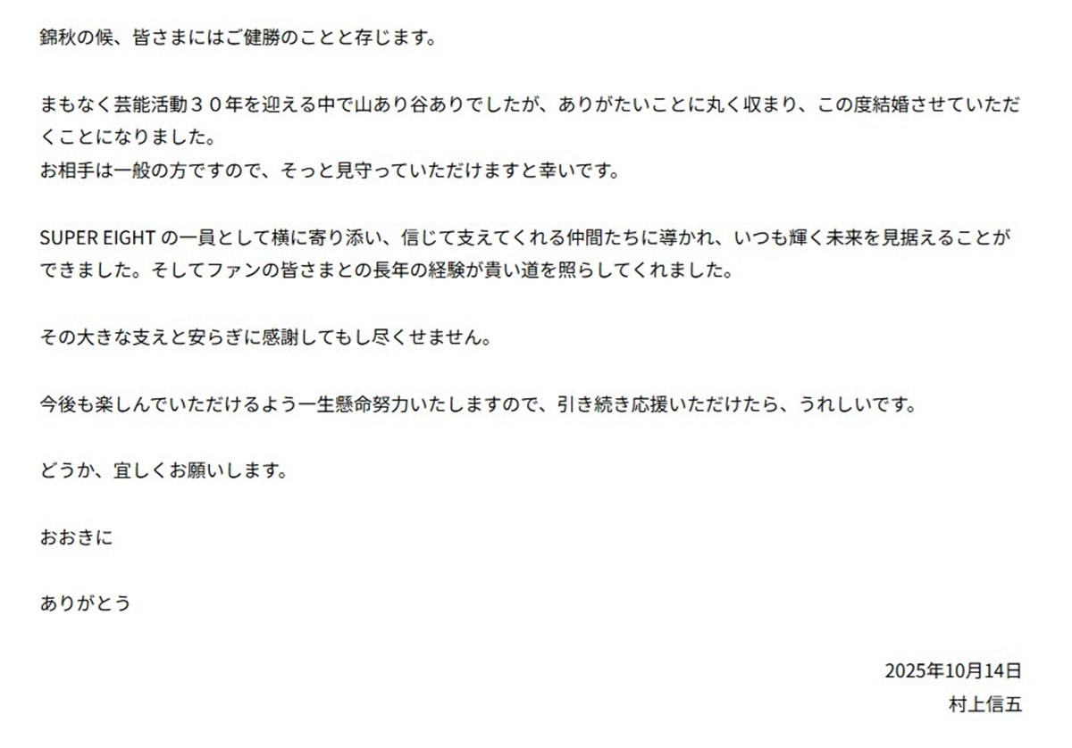 【ついに入籍】SUPER EIGHT 村上信五、結婚報告文に「メンバー全員の名前入り」配慮の演出にファン大歓喜(画像1/2)公開日:2025.10.15 更新日:2025.10.15