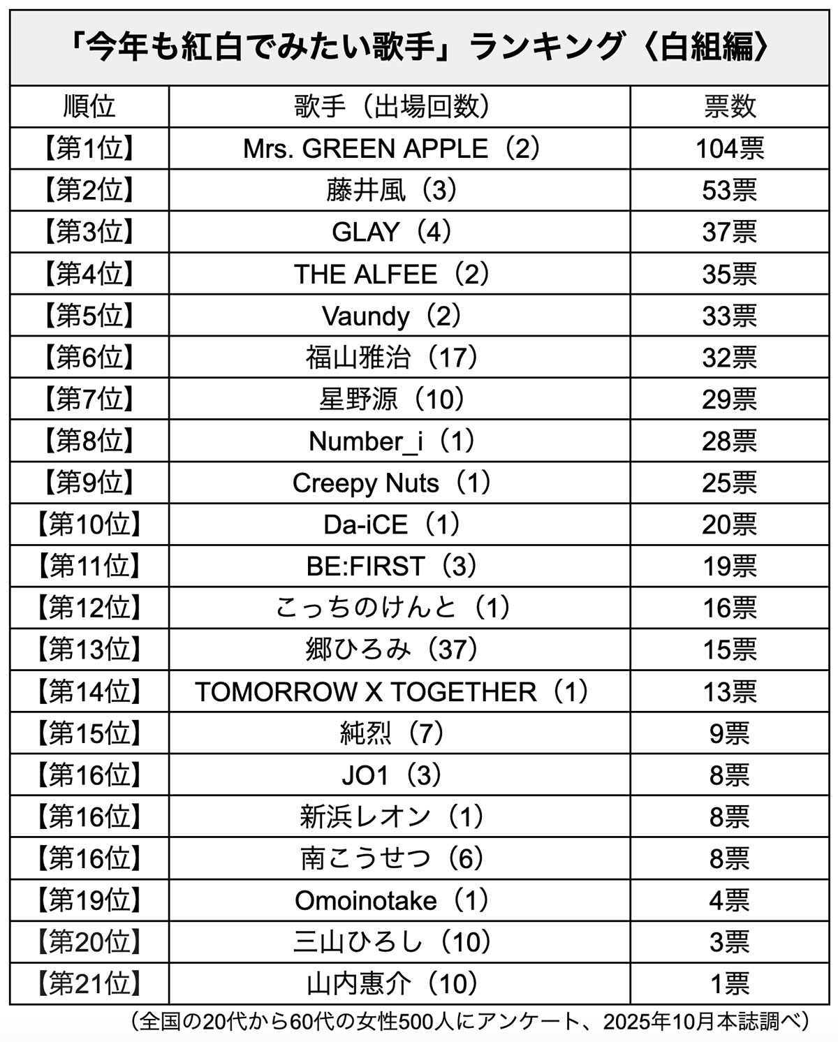 「今年も紅白でみたい歌手」ランキング〈白組編〉GLAY、藤井風を抑えた1位に「出るのは当然」の声【500人にきいた】(画像1/2)公開日:2025.10.22 更新日:2025.10.22
