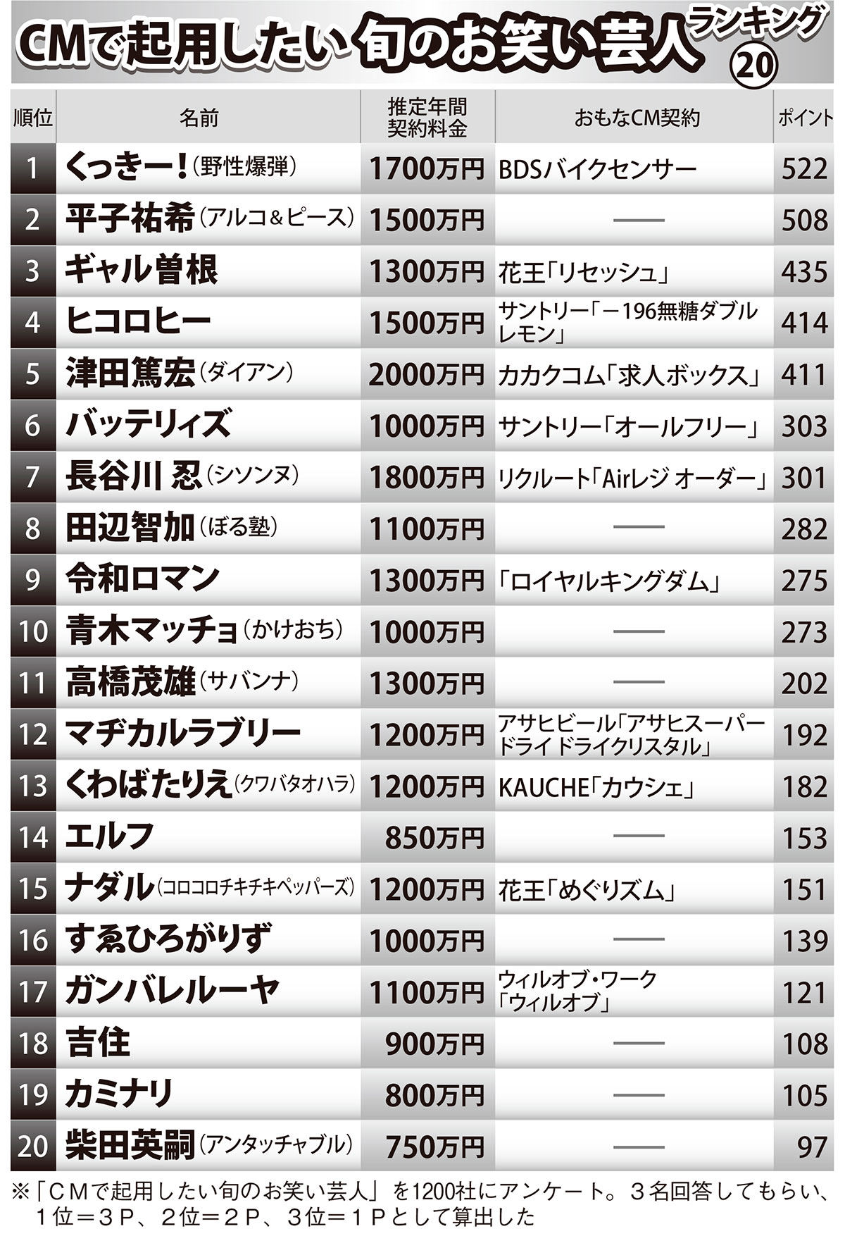 大手企業がCMに起用したいお笑い芸人ランキング 3位ギャル曽根、2位アルコ平子を抑えた1位“暴走芸人”は?【1200社緊急調査】(画像1/7)公開日:2025.10.24 更新日:2025.10.24