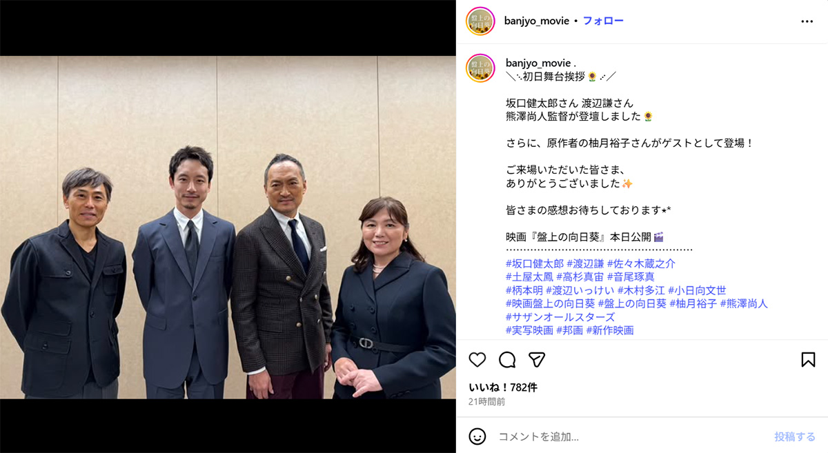 『盤上の向日葵』の初日舞台あいさつに出席した(左から)熊澤尚人監督、坂口健太郎、渡辺謙、原作者・柚月裕子氏(10月31日投稿の『盤上の向日葵』のInstagram「@banjyo_movie」より)