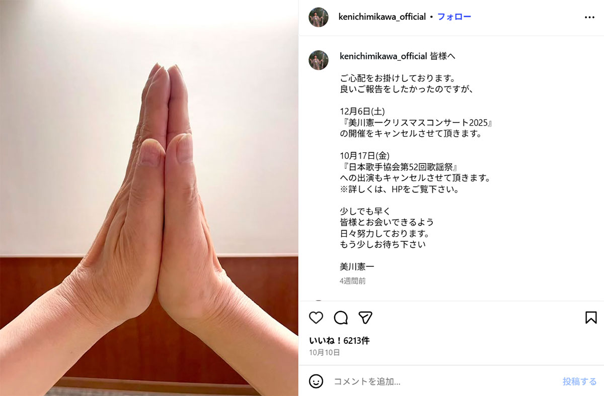 12月6日に予定されていた『美川憲一クリスマスコンサート2025』の開催キャンセルを報告する美川憲一(美川のInstagram《@kenichimikawa_official》に10月10日投稿)