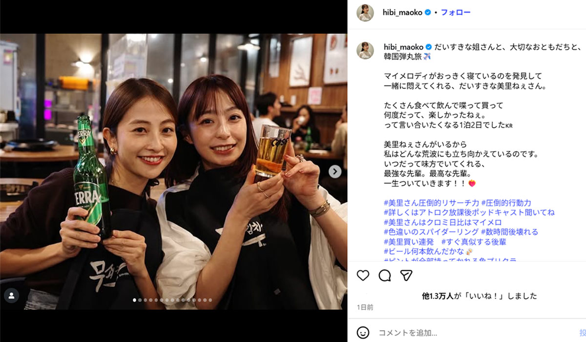 フリーの宇垣美里アナウンサーと韓国旅行に行ったことを報告するTBSの日比麻音子アナウンサー(日比アナのInstagaram《@hibi_maoko》に11月17日投稿)