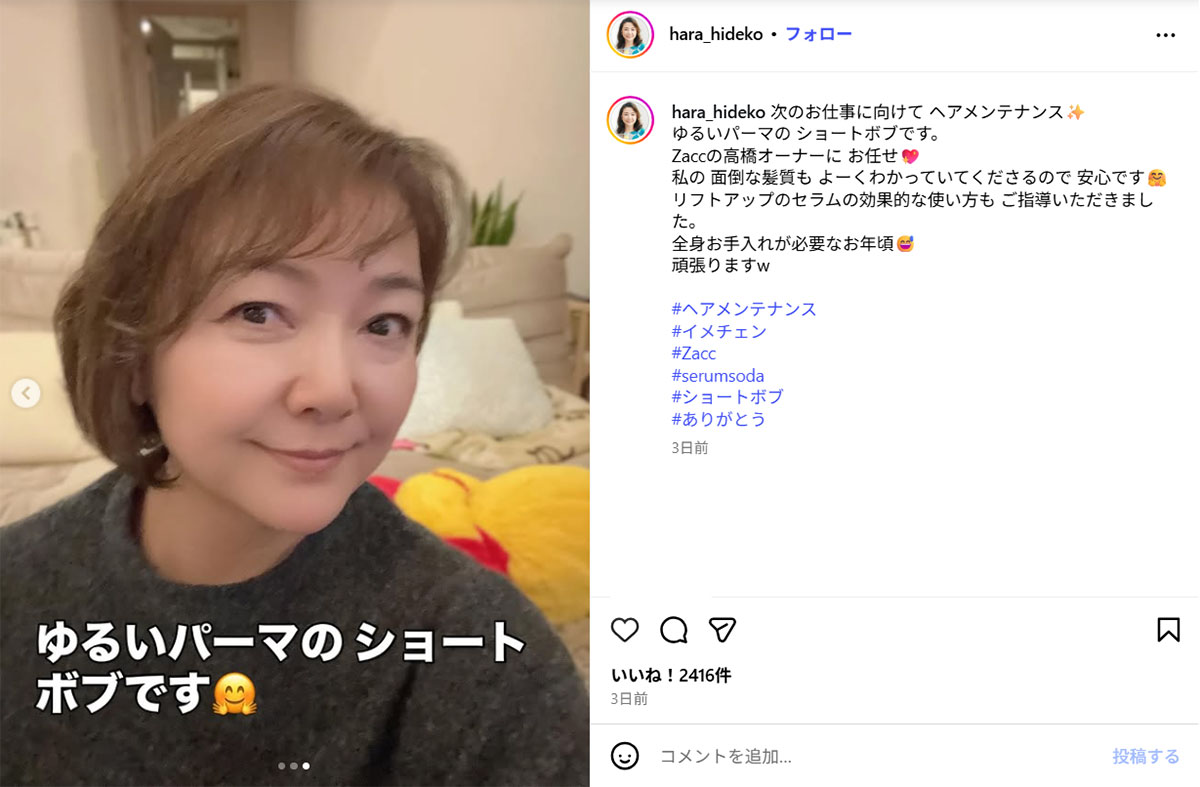 ゆるいパーマのショートボブに髪型を変えたことを報告する原日出子(原のInstagram《@hara_hideko》に11月16日投稿)