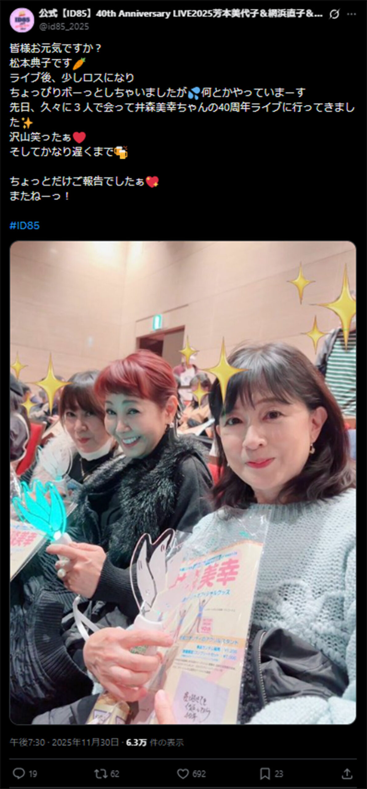 ミッチョン、アミー、のりりん「花の85年組」が“同期”井森美幸ライブ鑑賞、スリーショットにファン感激!(画像1/4)公開日:2025.12.03 更新日:2025.12.03