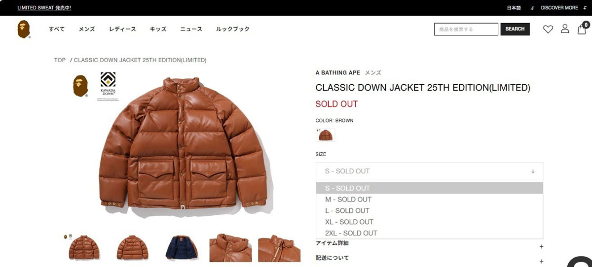 2001年に放送された主演ドラマ『HERO』(フジテレビ系)で木村拓哉が着用していたストリートウェアブランド「A BATHING APE」から発売された「LEATHER CLASSIC DOWN JACKET(レザークラシックダウンジャケット)」。商品の生誕25周年を記念し、世界限定50着で生産された(ブランドのHPより)