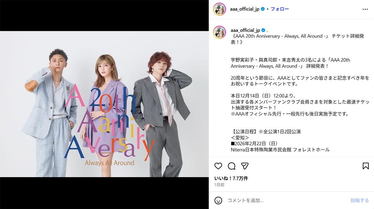 トークイベント「AAA 20th Anniversary - Always,All Around -」を開催する、AAAの與真司郎、宇野実彩子、末吉秀太(12月14日投稿のAAAの公式Instagram「@aaa_official_jp」より)