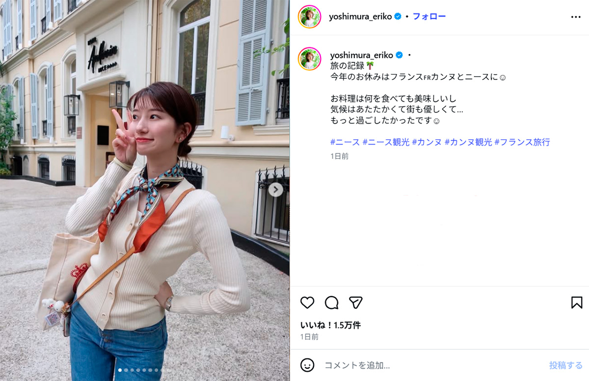 フランス旅行を報告したTBSの吉村恵里子アナ(写真・12月15日投稿の『吉村恵里子 / TBSアナウンサー』のInstagram「yoshimura_eriko」より)