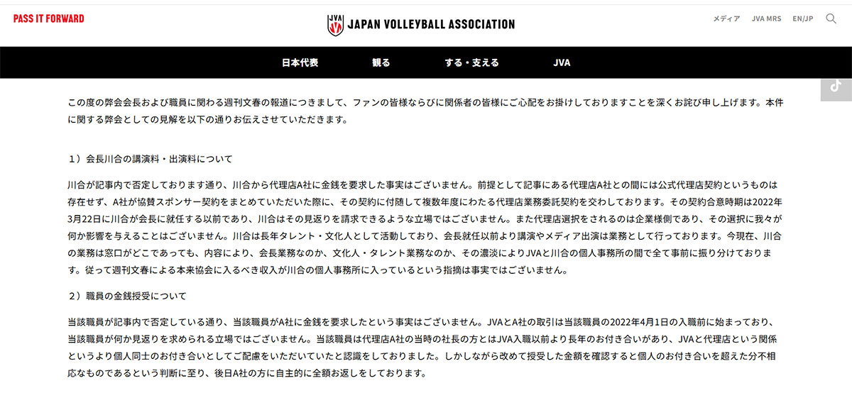 バレーボール協会がおこなった川合俊一に関する報道への反論(写真・公式ホームページより)