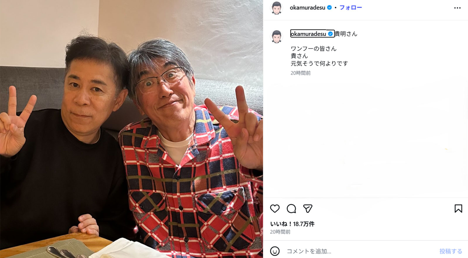 岡村隆史、“白髪姿” の石橋貴明と笑顔のツーショット公開…ラジオで明かした「3軒はしご」食欲旺盛に安堵の声も(画像1/6)公開日:2025.12.20 更新日:2025.12.20