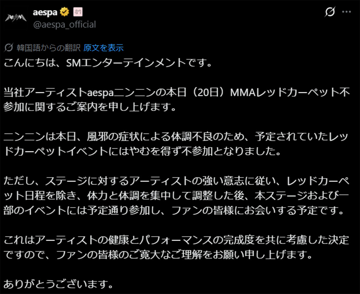 12月20日に開催された韓国最大規模の音楽授賞式「2025 MelOn Music Awards」でも、ニンニンは体調不良を理由に、レッドカーペットなどのイベントを欠席していた(aespaのXより)