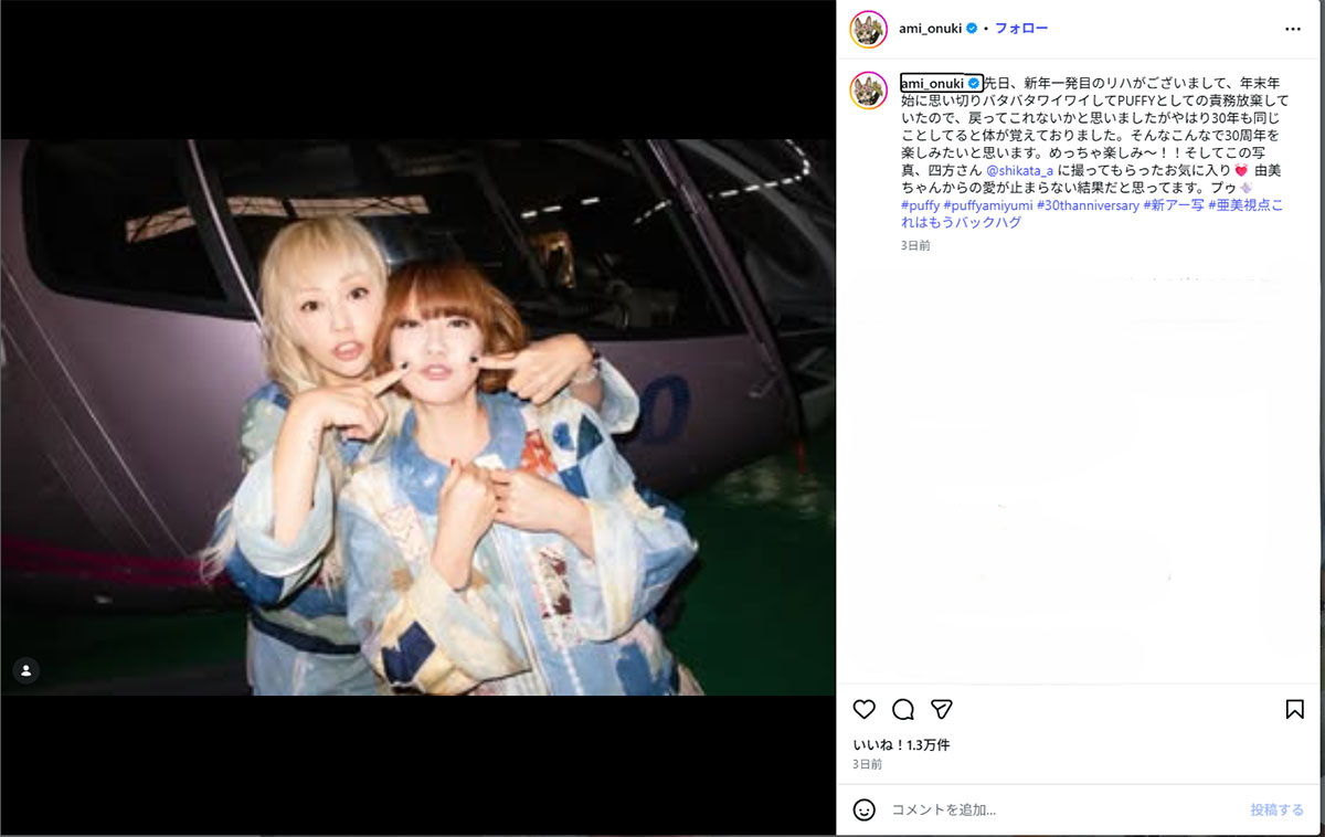 2026年1月13日、吉村由美との2ショットを公開したPUFFYの大貫亜美(@ami_onukiのInstagramより)