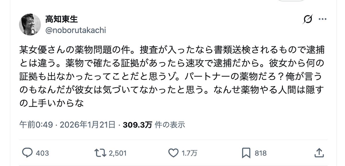 高知東生「某女優の薬物問題」に言及「彼女は気づいてなかったと思う」指摘に「すごい説得力」「希望的観測」意見分かれる(画像1/2)公開日:2026.01.21 更新日:2026.01.21