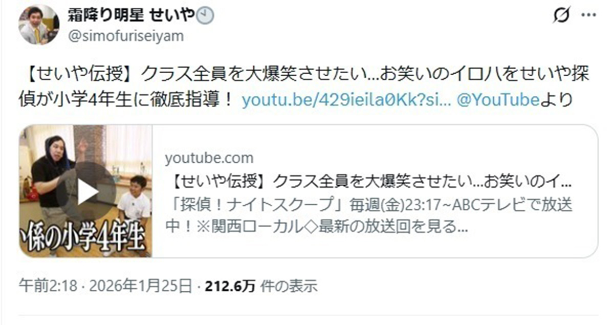 霜降りせいや、『ナイトスクープ』炎上後に “意味深投稿”…依頼者の少年に「大人になんなよ」発言で際立つ “1児の父” の漢気(画像1/6)公開日:2026.01.26 更新日:2026.01.26