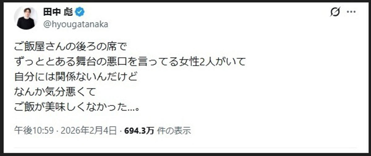 SixTONES 田中樹の兄「なんか気分悪くて」飲食店での “会話盗み聞き” 投稿が物議…家族炎上のたび “巻き添え” で集まる同情(画像1/4)公開日:2026.02.06 更新日:2026.02.06