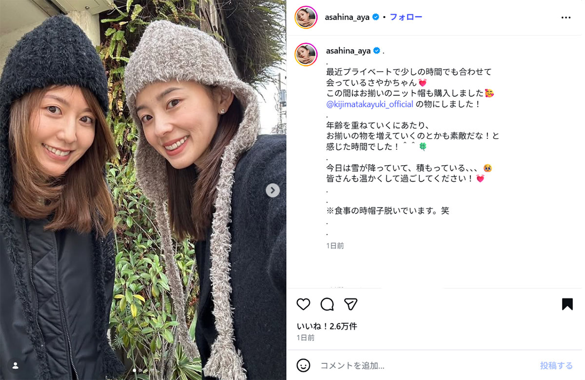 テレビ朝日の桝田沙也香アナウンサーとの “お揃いニット帽” 姿のツーショットを披露する朝比奈彩(朝比奈のInstagram《@asahina_aya》に2月8日投稿)