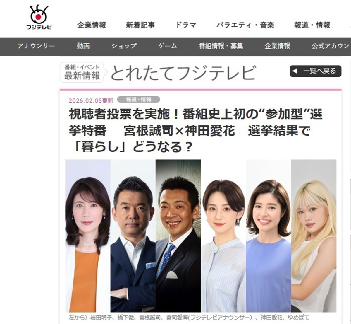 2月8日放送の『Live選挙サンデー』(フジテレビ系)に出演したフリーアナウンサーの神田愛花(フジテレビの公式HPより)