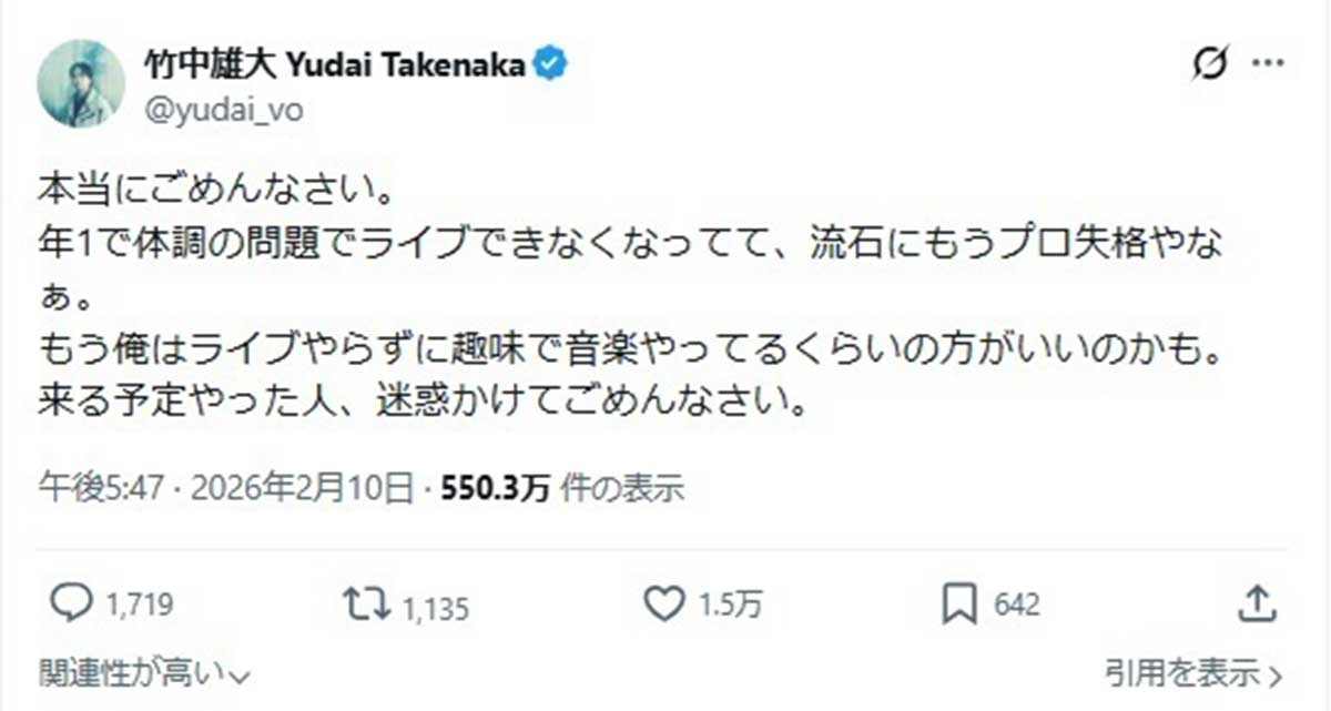 竹中雄大がXに投稿し物議を醸した投稿。「趣味で音楽やってるくらいの方がいいのかも」という内容は賛否を呼んだ(写真・本人のXより)