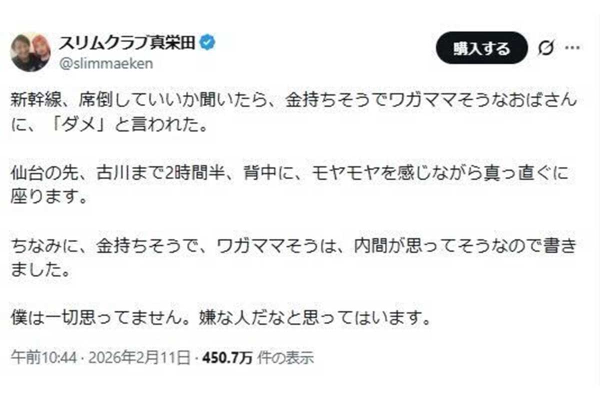 新幹線で“シート倒せず”2時間半…スリムクラブ真栄田「ワガママそうなおばさん」へのモヤモヤ体験告白が波紋(画像1/3)公開日:2026.02.11 更新日:2026.02.11