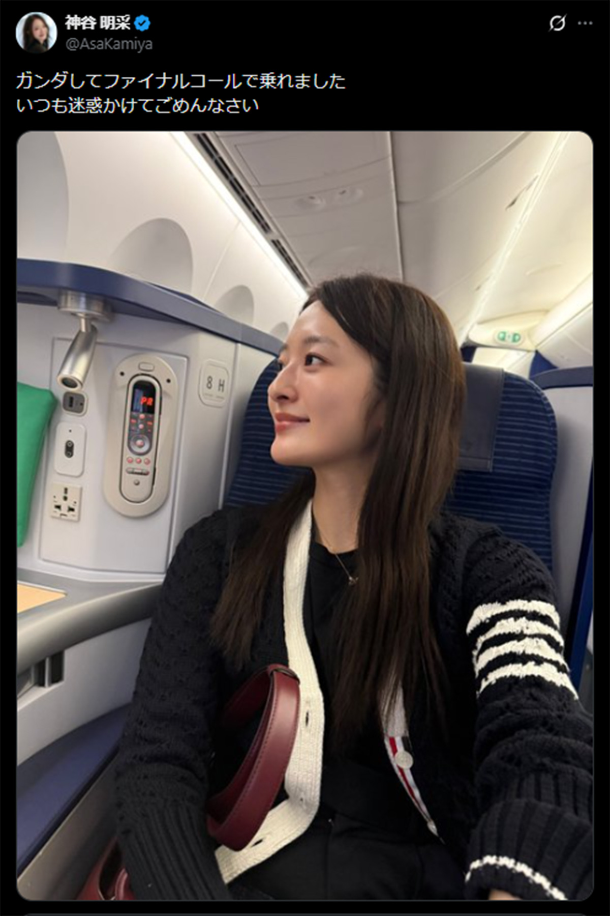 ファイナルコールで登場した機内での姿を披露した神谷明采(神谷のX《@AsaKamiya》に2月11日投稿)