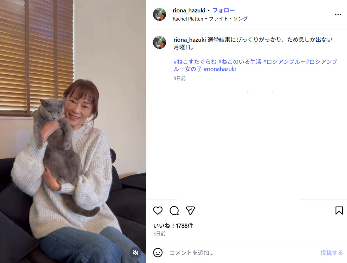 「選挙結果にびっくりがっかり、ため息しか出ない月曜日」とコメントした葉月里緒奈(葉月のInstagram《@riona_hazuki》に2月9日投稿)