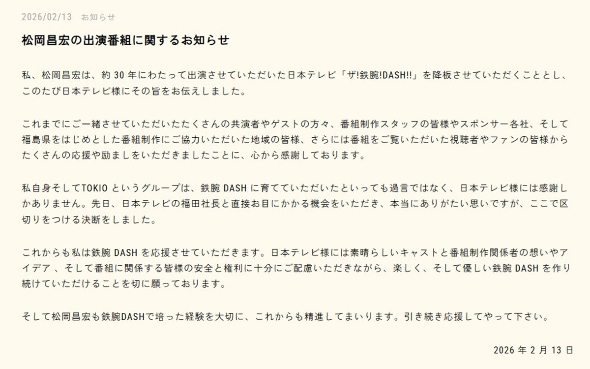 松岡昌宏 『鉄腕DASH』降板表明 日本テレビに向けた“5文字”に込められた“国分降板”への不信感(画像1/7)公開日:2026.02.13 更新日:2026.02.13
