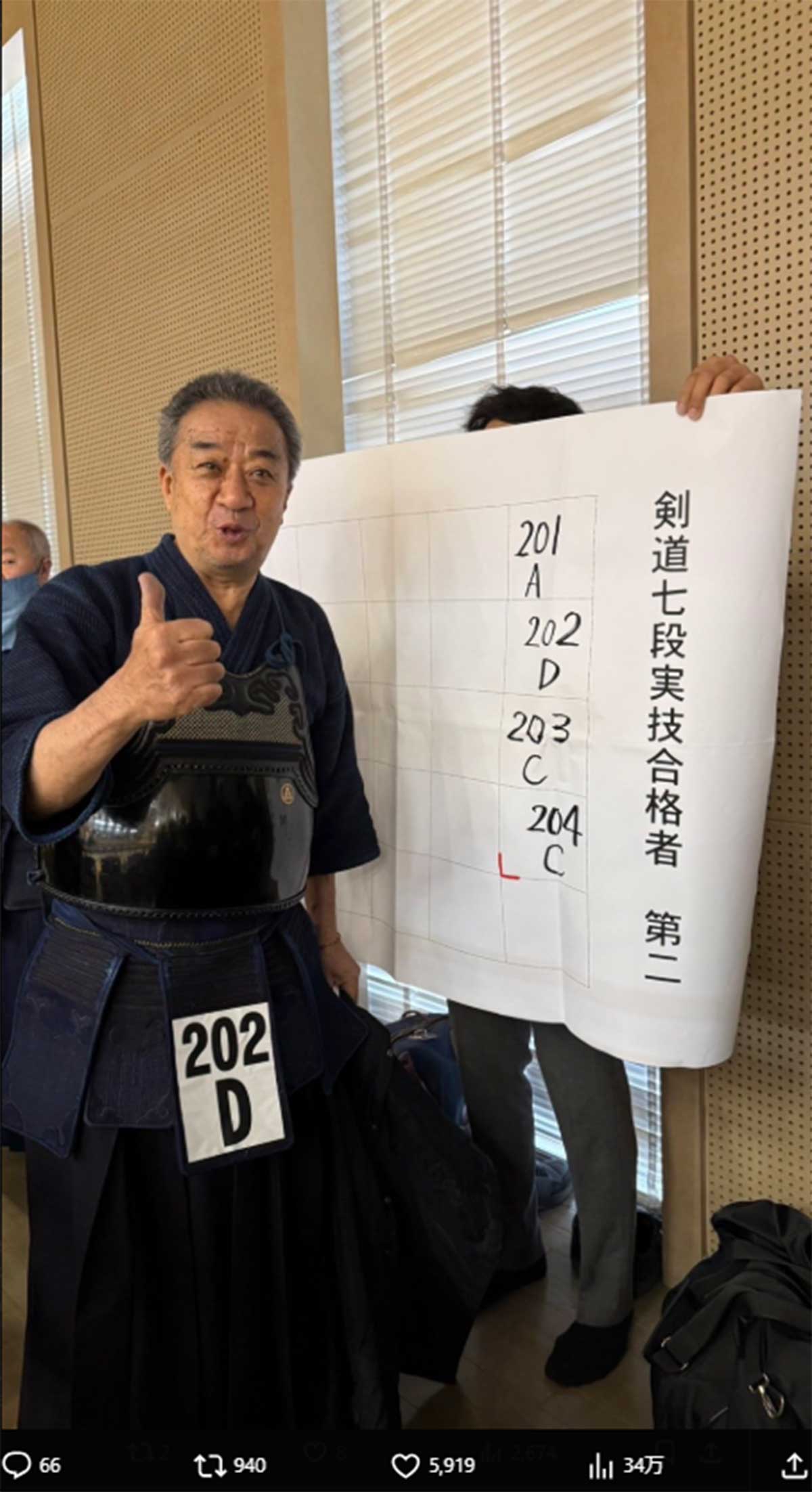 剣道七段に合格した渡辺正行(写真・2月14日投稿のゴリけんのX「@goriken1024」より)