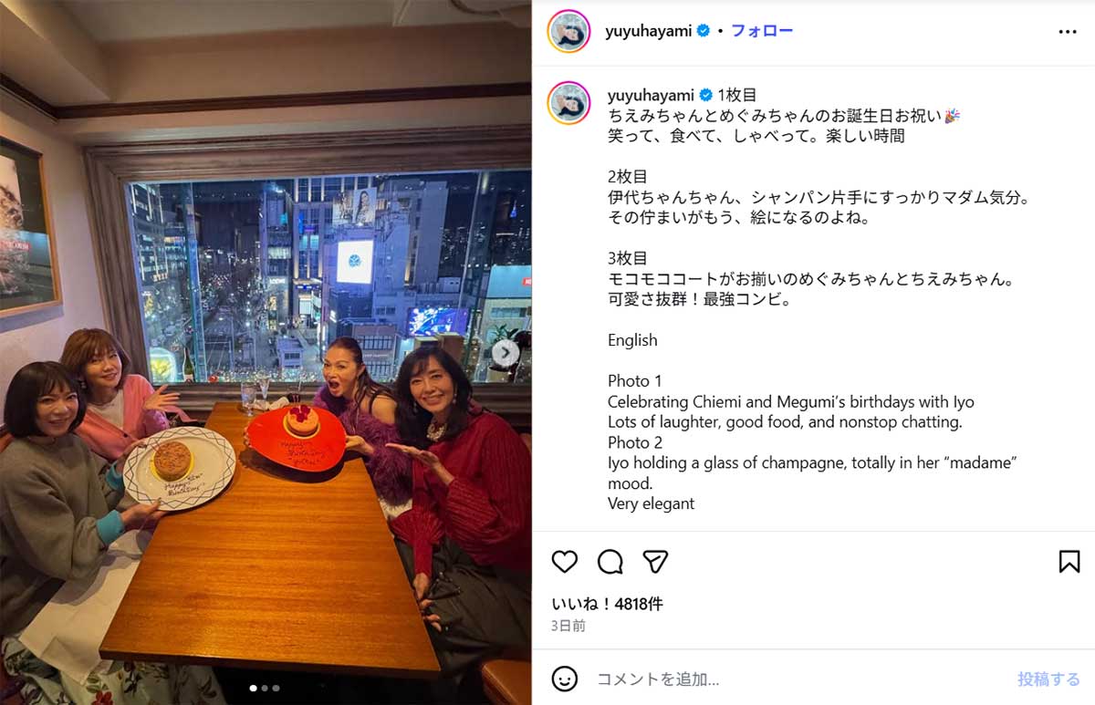 左から堀ちえみ、松本伊代、渡辺めぐみ、早見優(早見のInstagram《@yuyuhayami》に2月13日投稿)