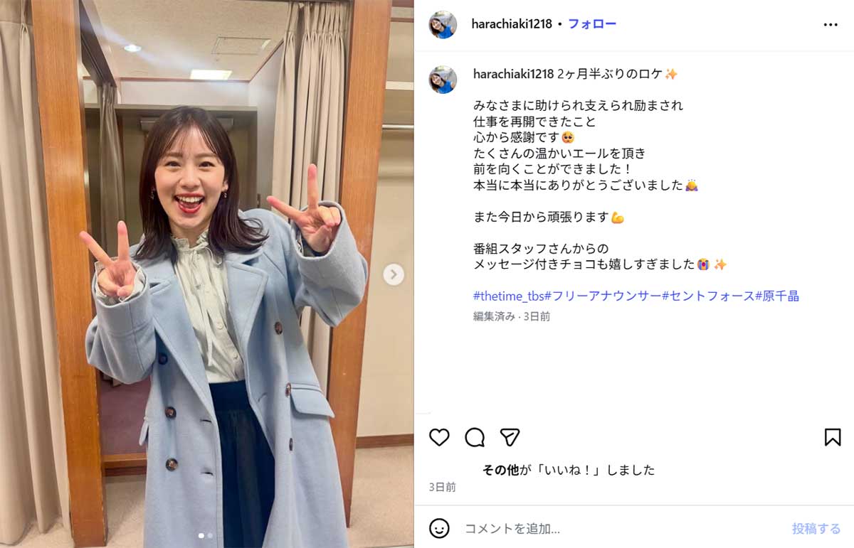 原千晶アナ、『THE TIME,』ロケ2カ月ぶり復帰報告…骨折からの回復を逐次報告してファンも安堵(画像1/4)公開日:2026.02.17 更新日:2026.02.17