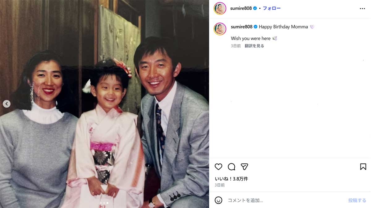 すみれ、亡き母・松原千明さん誕生日にスリーショット公開しファン感動 父・石田純一も「理解が追いつかない」急逝の報(画像1/2)公開日:2026.02.22 更新日:2026.02.22
