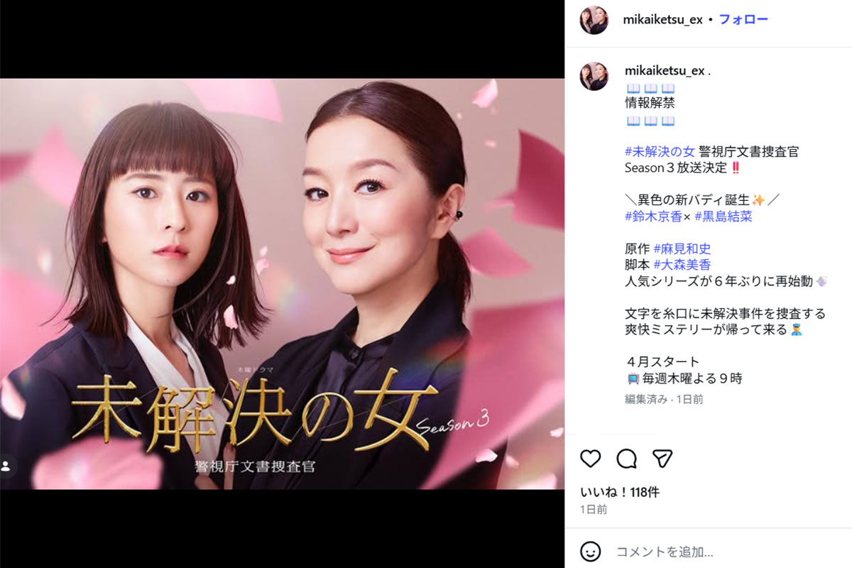 鈴木京香と黒島結菜がバディを組むテレビ朝日系で4月期放送の『未解決の女 警視庁文書捜査官 Season3』(画像・2月23日投稿の『「未解決の女 警視庁文書捜査官」4月スタート!木曜よる9時【テレビ朝日公式】』のInstagram「@mikaiketsu_ex」より)