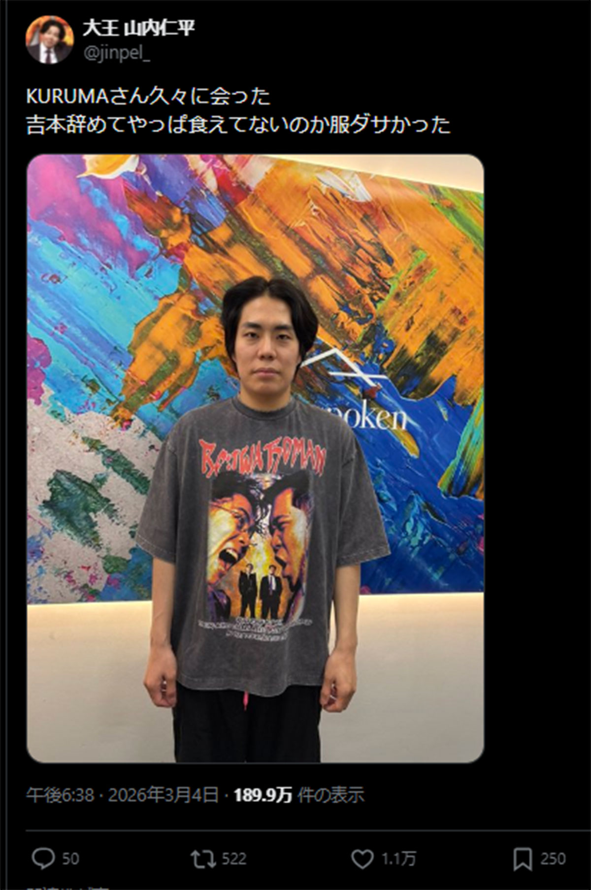 令和ロマン・くるま、「吉本辞めてやっぱ食えてないのか」後輩から“ヨレヨレTシャツ”イジリも「生地がいいよね」ザコシは絶賛(画像1/5)公開日:2026.03.05 更新日:2026.03.05