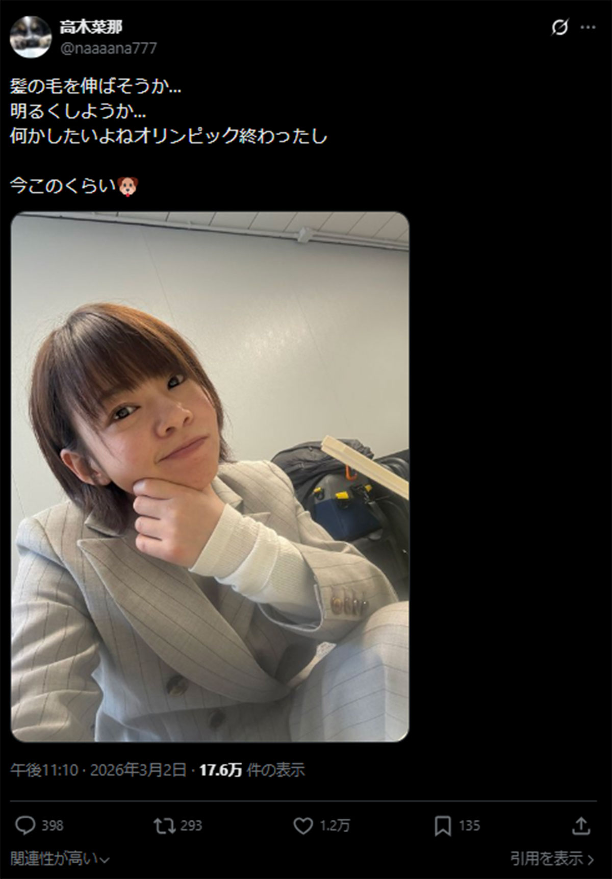 髪型の変更を示唆した高木菜那(高木のX《@naaaana777》に3月2日投稿)