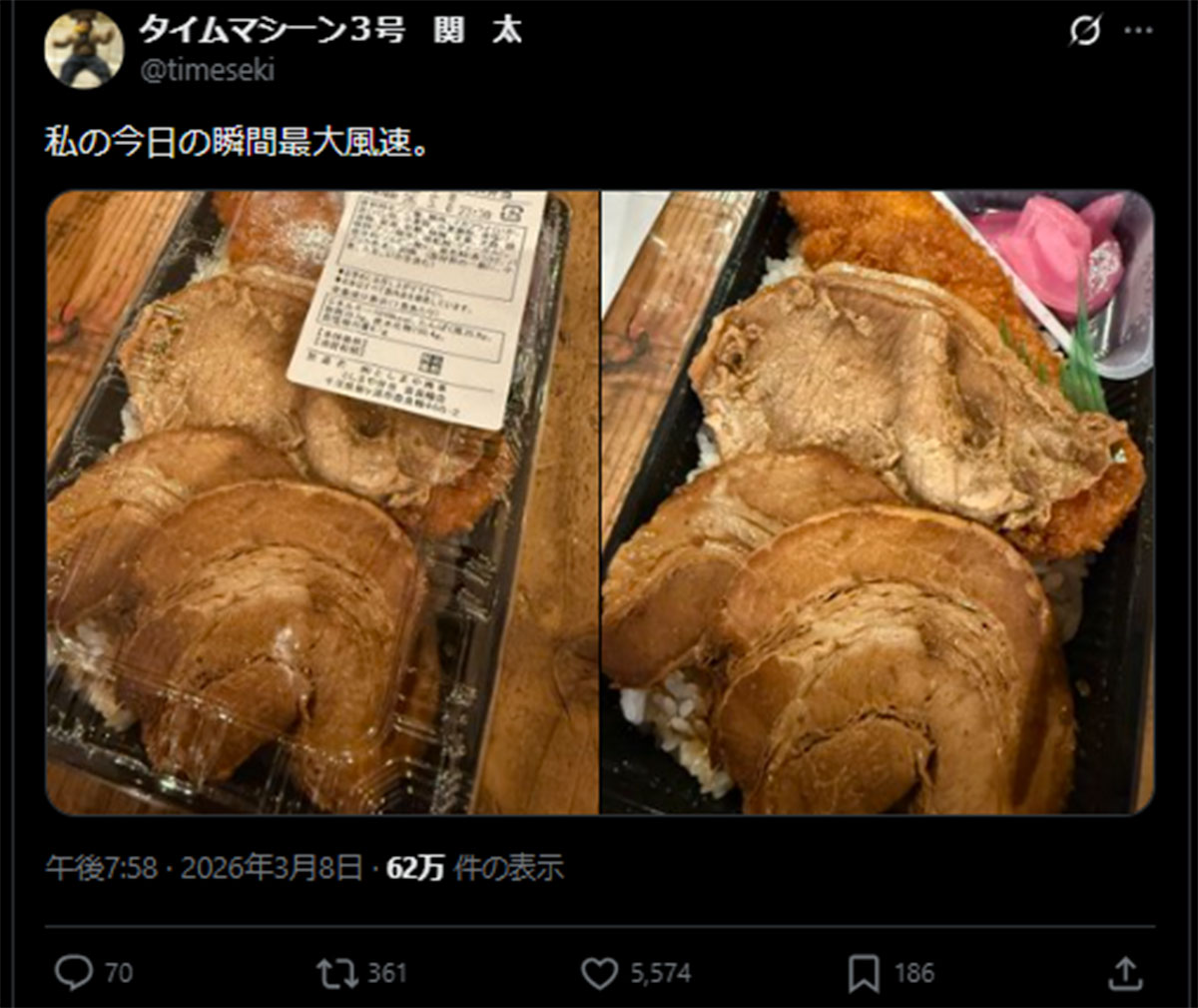 タイムマシーン3号の関太が投稿した「としまや」の「としまやゴージャス弁当」(画像・3月8日投稿の『タイムマシーン3号 関 太』のX「@timeseki」より)