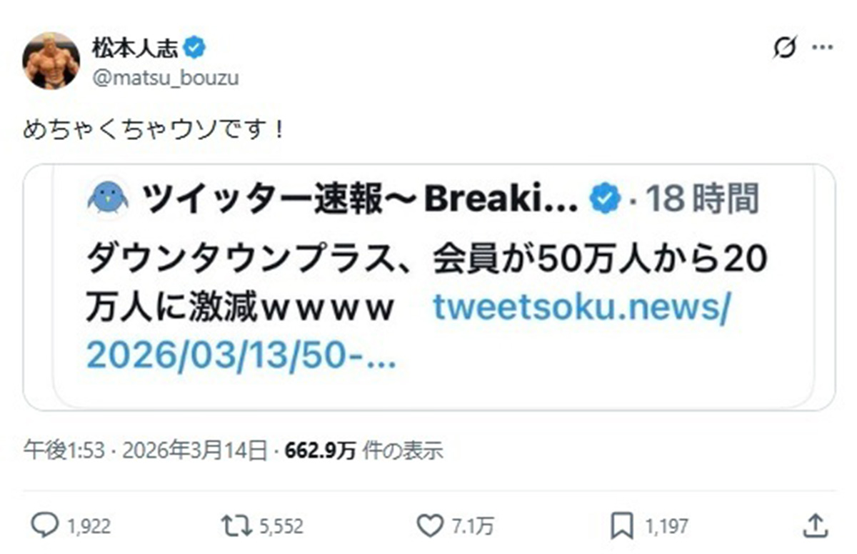 松本人志 4カ月ぶりにXを更新『DOWNTOWN +』会員激減デマを完全否定、自ら釘打つ言葉にファン歓喜(画像1/12)公開日:2026.03.14 更新日:2026.03.14
