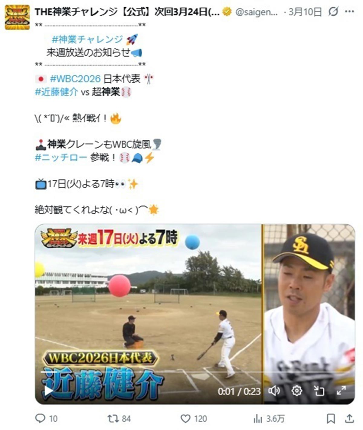 TBS『神業チャレンジ』近藤健介回に不満の声…WBC直前の企画挑戦で「フォーム崩れた」過酷チャレンジへの非難殺到(画像1/3)公開日:2026.03.18 更新日:2026.03.18