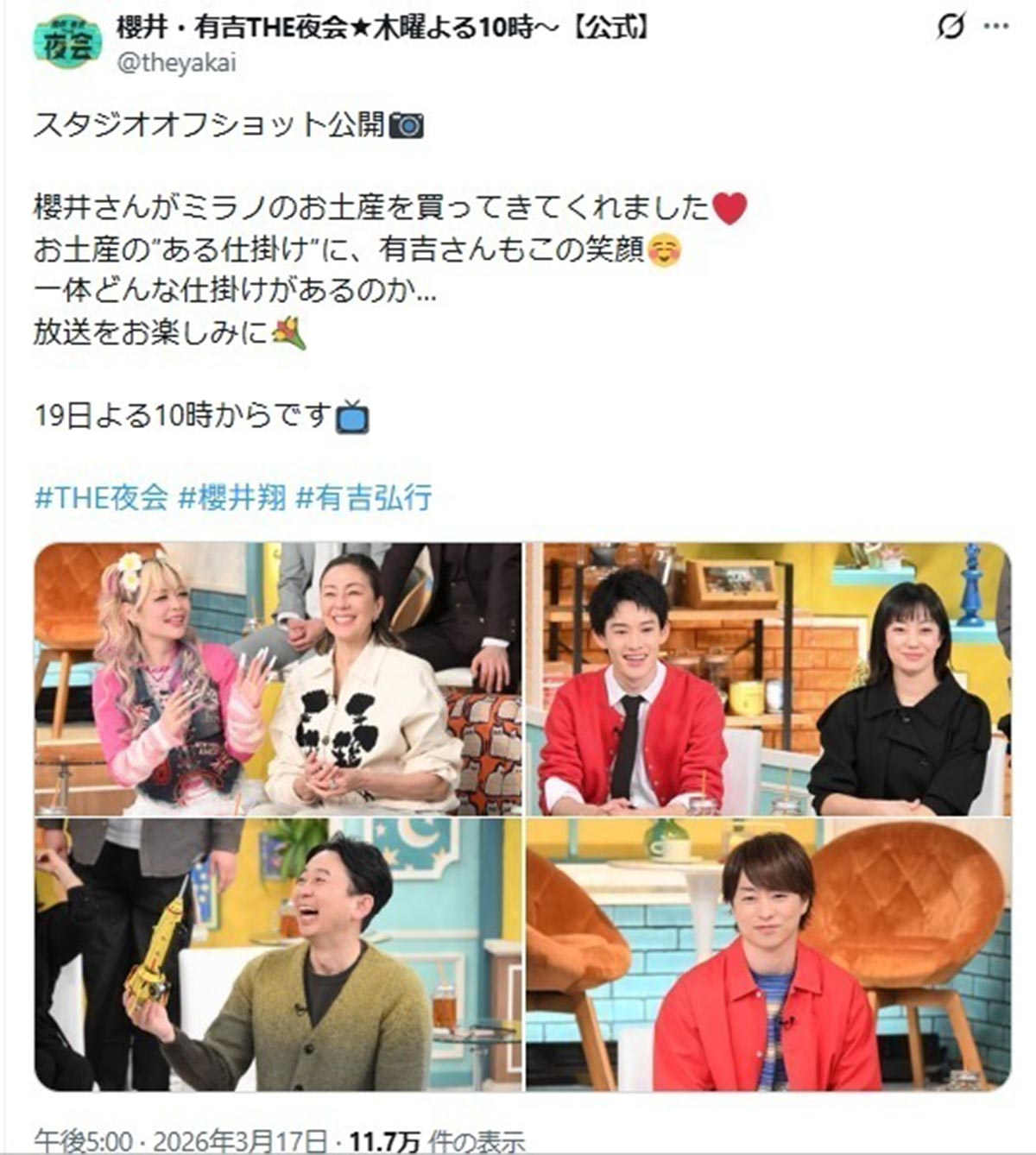 2026年1月29日、バラエティ番組『櫻井・有吉THE夜会』(TBS系)の2時間スペシャルに出演した嵐の櫻井翔(@theyakaiのXより)