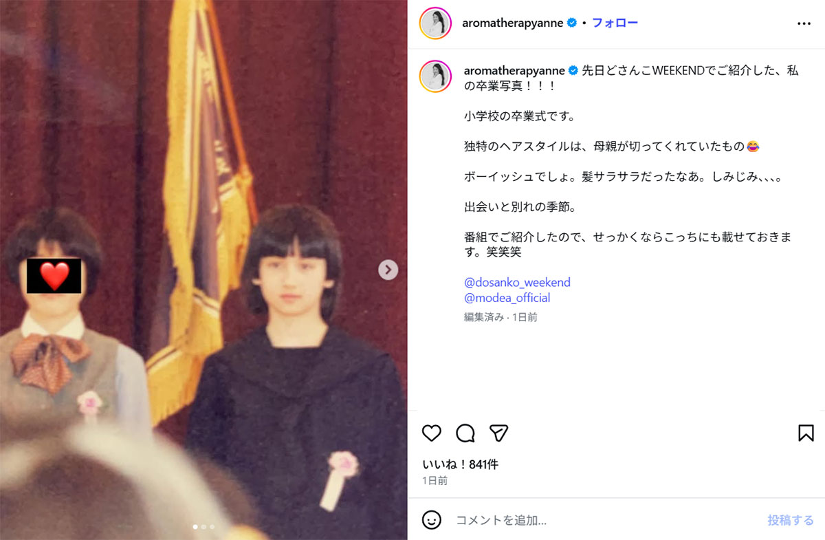 小学校の卒業式での写真を公開した元TBSアナウンサーのアンヌ遙香(画像・3月25日投稿のアンヌ遙香のInstagram「@aromatherapyanne」より)