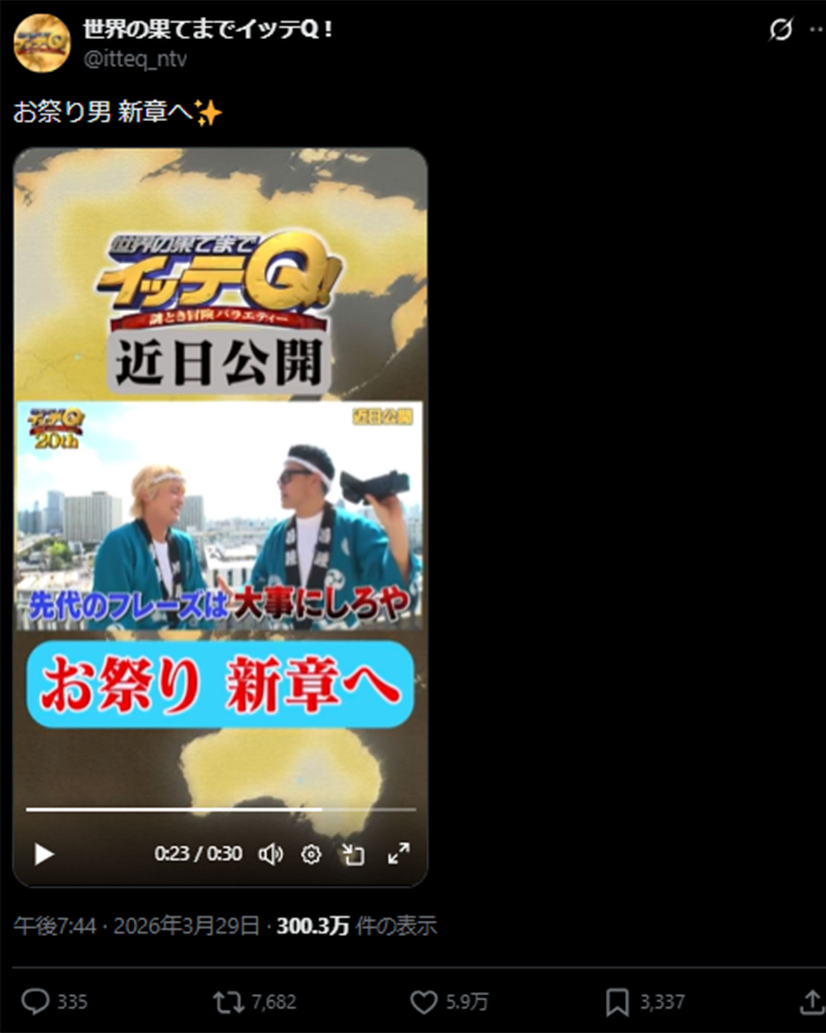 手越祐也、『イッテQ!』予告で宮川大輔から「お祭り男」継承を示唆されファン歓喜…ドラマもバラエティも大復活が見えてきた!(画像1/8)公開日:2026.03.30 更新日:2026.03.30