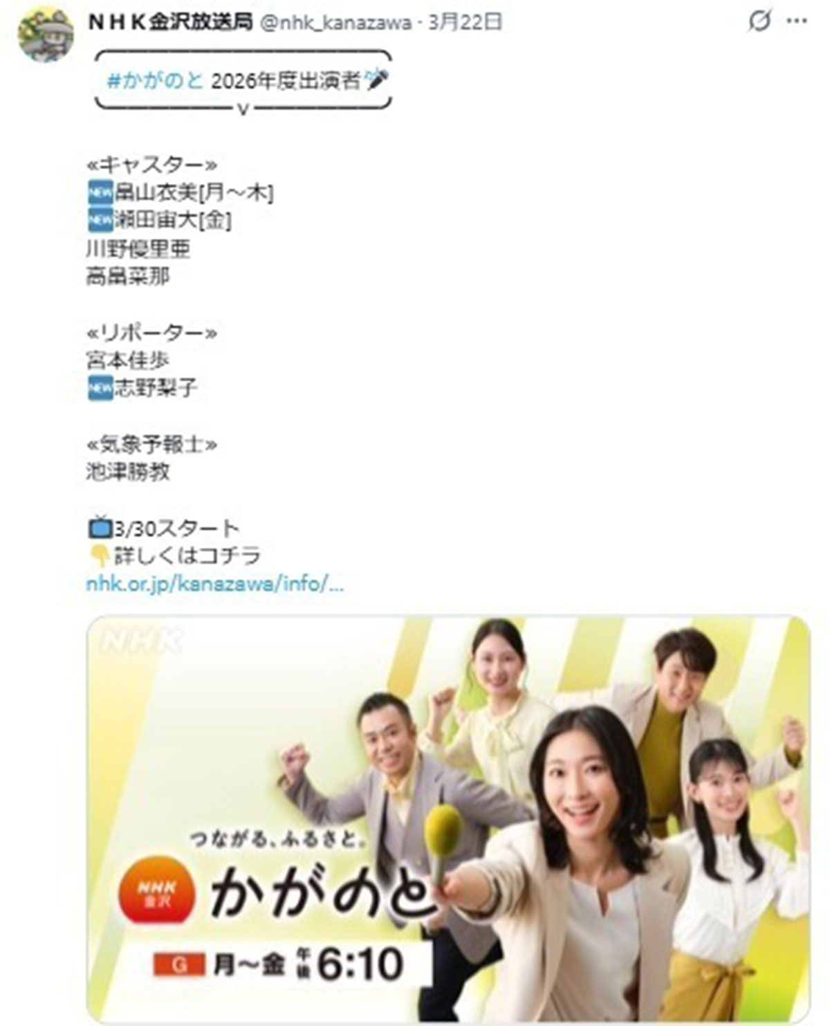 NHK畠山衣美アナ“略奪不倫疑惑”から1年、金沢ローカル報道番組で復帰…双方“お咎めなし”の結末、SNSでは続く“異変”(画像1/7)公開日:2026.03.31 更新日:2026.03.31