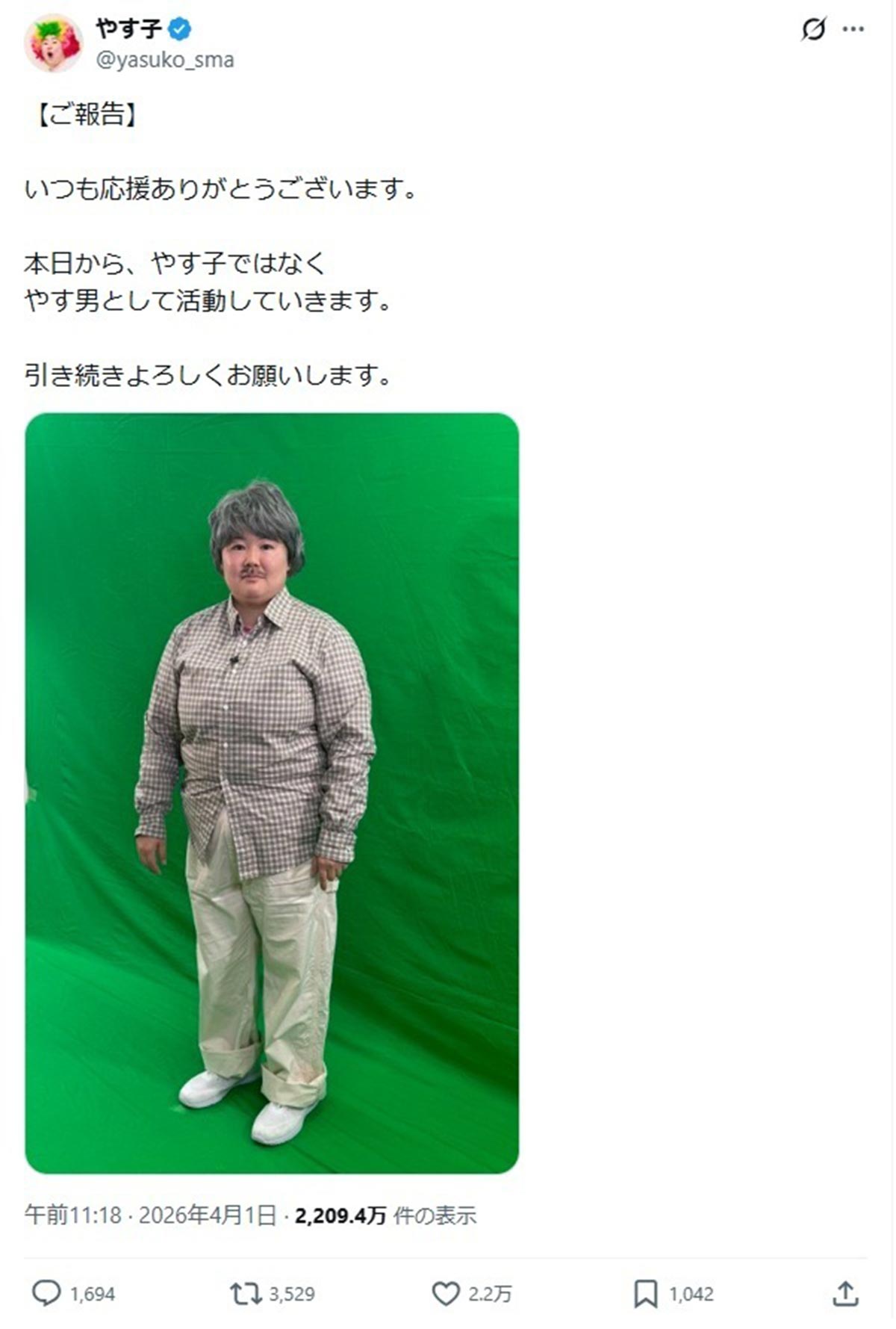やす子「やす男として活動」エイプリルフールの冗談投稿が大誤算「つまらなくて悲しい」酷評噴出(画像1/13)公開日:2026.04.02 更新日:2026.04.02
