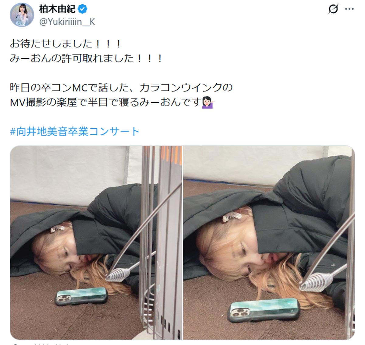 卒業コンサート後に楽屋で寝ていた向井地美音(画像・柏木由紀のX「@Yukiriiiin__K」より)