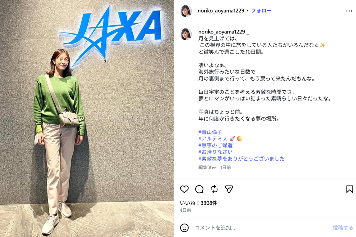 国際有人月探査プロジェクト「アルテミス計画」の宇宙船「オリオン」の飛行士4人の無事の帰還を喜ぶ青山倫子(画像・4月12日投稿の青山倫子のInstagram「@noriko_aoyama1229」より)