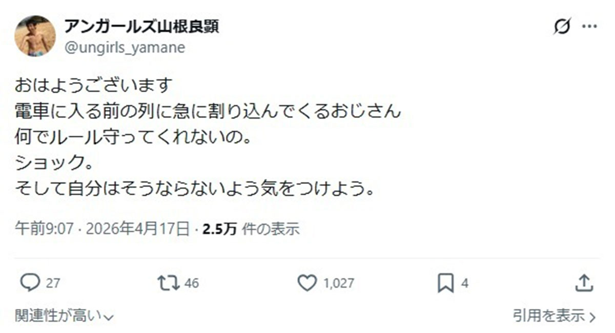 アンガールズ山根が投稿した電車を待つ列への割り込み行為への告発。多くの人が怒りを抱えているようだ(写真・本人のXより)