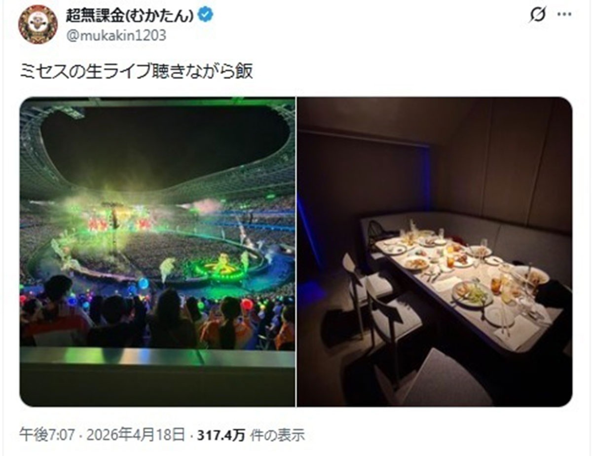 2026年4月19日、東京のMUFGスタジアム(国立競技場)でMrs.GREEN APPLEのライブがおこなわれた。スイートルームでのライブ観賞を投稿していた「超無課金」名義で配信者としても活動する経営者の石田拳智氏は、「迷惑行為は自分たちではない」と即座に否定した(@mukakin1203のInstagramより)