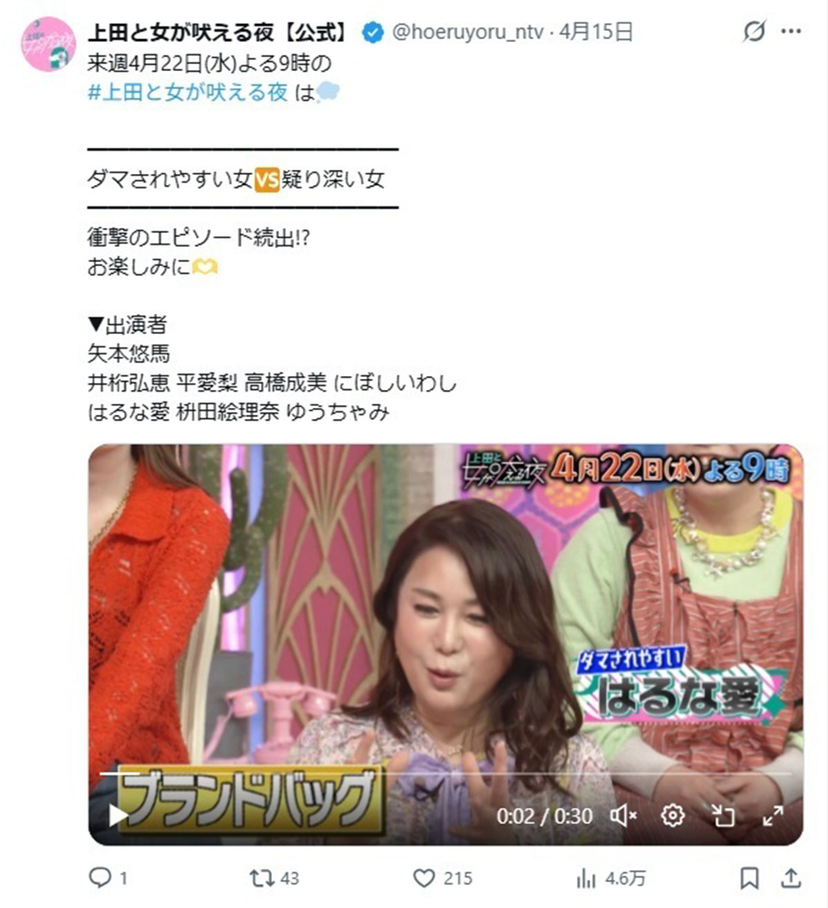 ビジュアルの変化に注目が集まったはるな愛(写真・番組公式Xより)